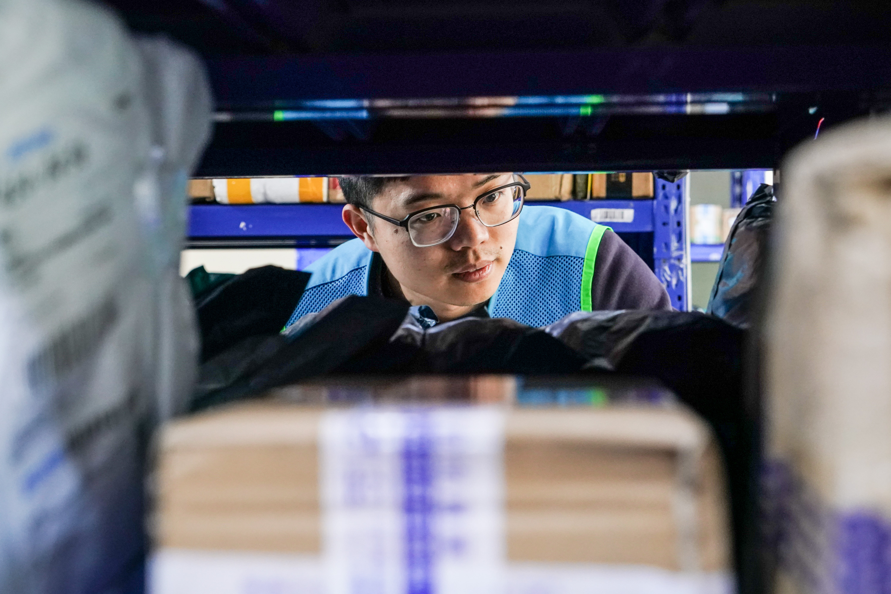 A young man working in the delivery sector arranges parcels in Kunshan, east China's Jiangsu Province, April 29, 2019. (Xinhua/Li Bo)