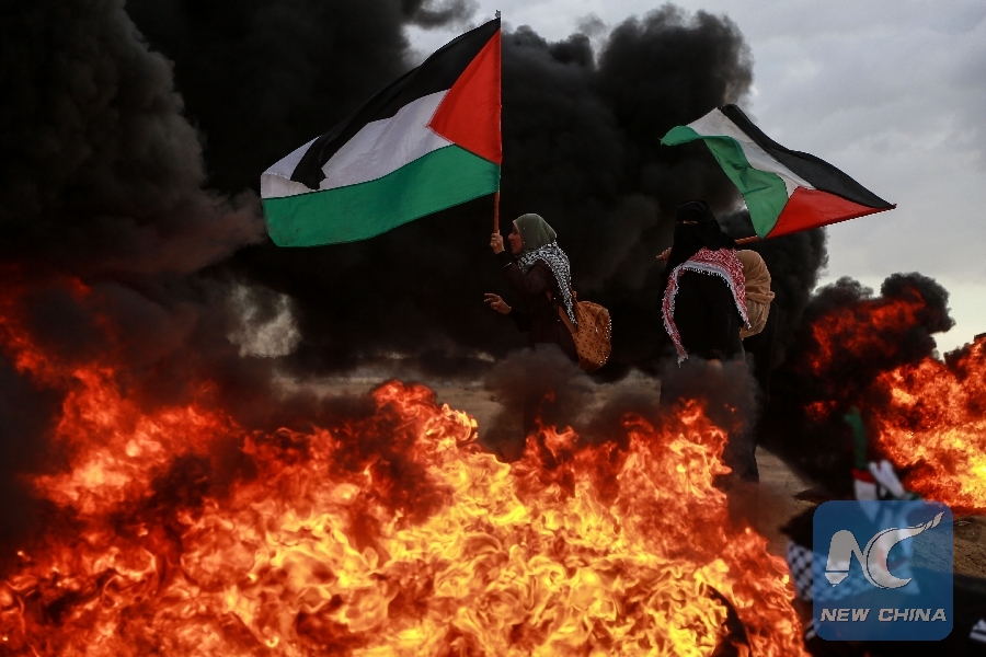 Palestinian protesters clash with Israeli soldiers on the Gaza-Israel border, east of Gaza City, on Oct. 26, 2018. Four Palestinians were killed and dozens of others injured Friday during clashes with Israeli soldiers stationed on the border between eastern Gaza Strip and Israel, medics said. (Xinhua Photo)
