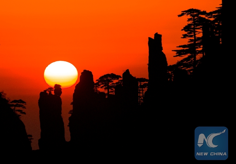 Located in east China's Anhui Province, the mountain range is famous for its magnificent scenery of granite peaks, rocks, pine trees, sunrise and sunset amid clouds.