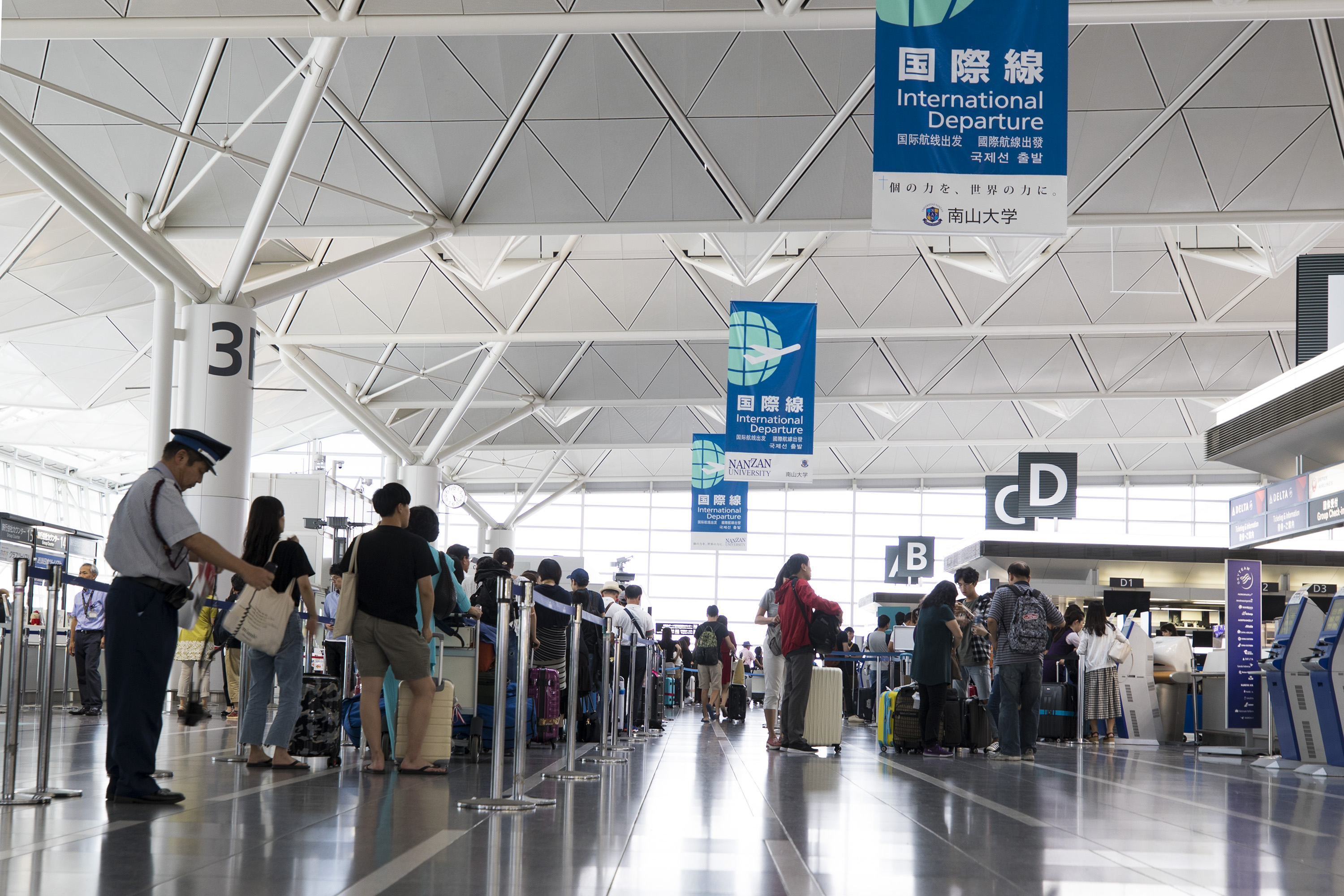 Passengers are waiting in line at the check-in counters at an international airport in Nagoya in Japan on Sept. 6, 2018. (Xinhua)