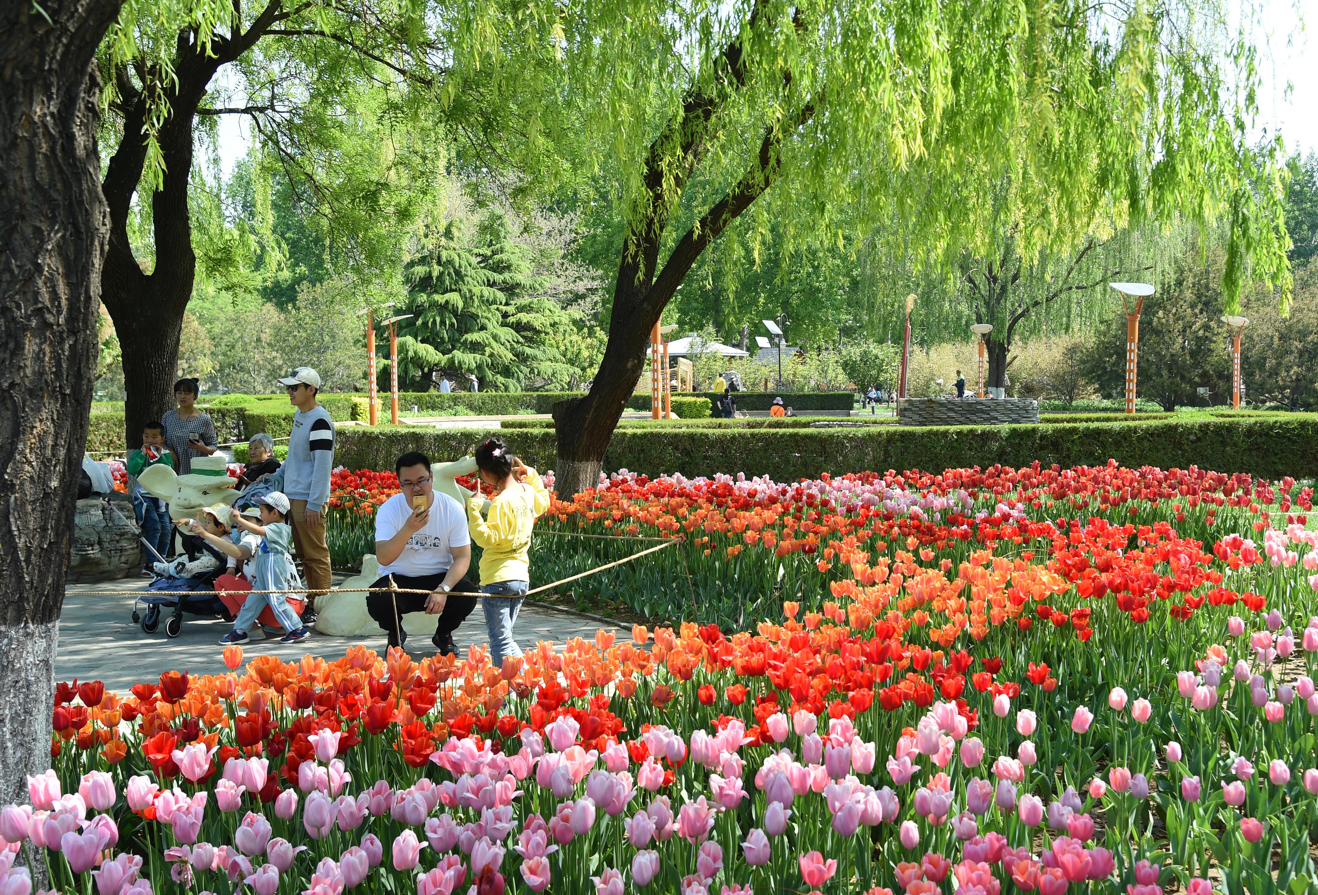 Visitors have fun amid tulip flowers in Beijing Garden of World's Flowers in Fengtai District in Beijing, capital of China, May 2, 2019, during the Labor Day national holiday. (Xinhua)