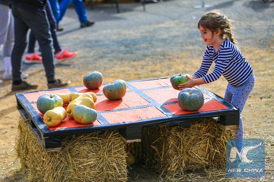A girl plays Tic-Tac-Toe with pumpkins on Pumpkin Festival in Collector, half an hour's drive from Australian capital Canberra, on May 5, 2019. (Xinhua/Pan Xiangyue)
