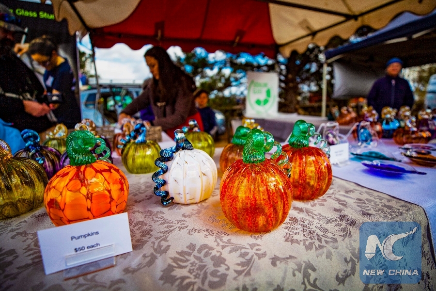 Pumpkin-shaped glassware are seen at a booth on Pumpkin Festival in Collector, half an hour's drive from Australian capital Canberra, on May 5, 2019. (Xinhua/Pan Xiangyue)