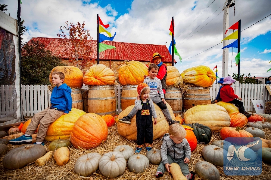 Children play with pumpkins on Pumpkin Festival in Collector, half an hour's drive from Australian capital Canberra, on May 5, 2019. (Xinhua/Pan Xiangyue)
