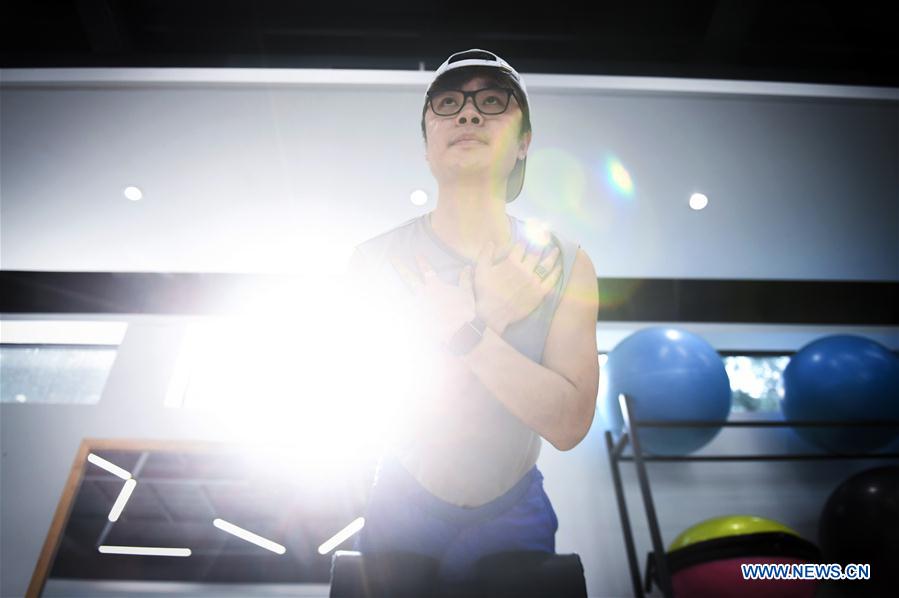 Xiao Guoxun exercises at a club in Shenzhen, south China's Guangdong Province, April 17, 2019. 33-year-old Xiao Guoxun, an entrepreneur who runs business on healthy food in Shenzhen, insisted in trying a sport after every birthday since his 30. He tried hiking in 2016, running marathon in 2017 and rowing in 2018. He have joined in a rowing club and takes part in rowing training every Tuesday and Thursday. He said rowing requires every member to make concerted efforts to win the game and rowing help him relax from work stress and become more concentrated on things. He believed the progress he made in sports proves that he has the capability to do work better. (Xinhua/Mao Siqian)
