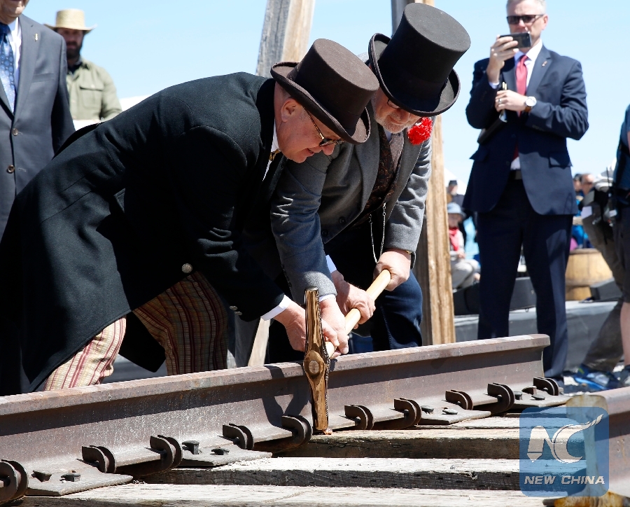 Guests drive the "last spike" during a historical re-enactment to celebrate the 150th anniversary of the completion of the first U.S. transcontinental railroad at the Golden Spike National Historical Park at Promontory Summit, Salt Lake City, the United States, May 10, 2019. (Xinhua/Li Ying)