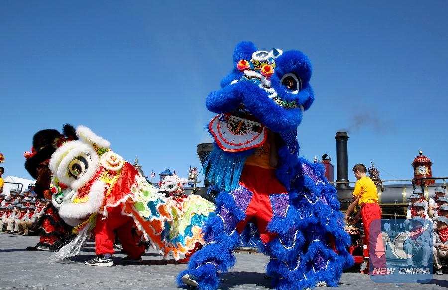 Artists perform Chinese lion dance during the celebration for the 150th anniversary of the completion of the first U.S. transcontinental railroad, at the Golden Spike National Historical Park at Promontory Summit, Salt Lake City, the United States, May 10, 2019. (Xinhua/Li Ying)