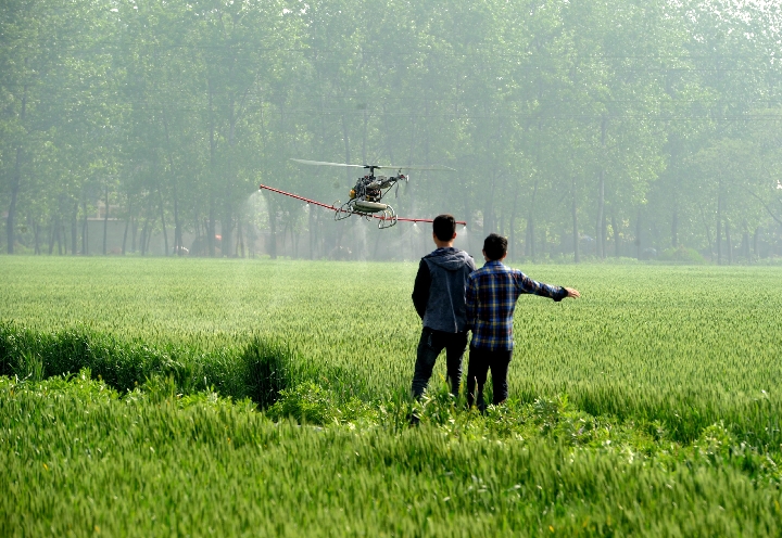 An unmanned aerial vehicle (UAV) sprays pesticide on a wheat field in Woyang County, east China's Anhui Province, April 23, 2014. (Xinhua/Liu Junxi)