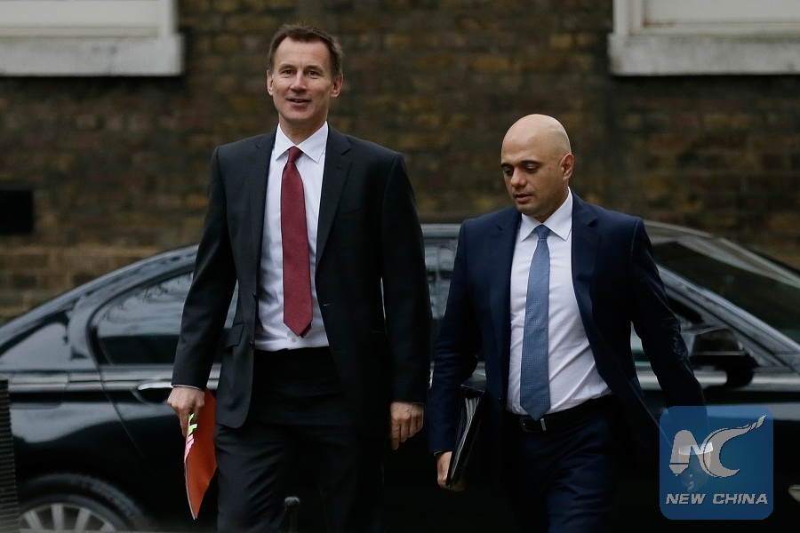 Britain's Secretary of State for Foreign and Commonwealth Affairs Jeremy Hunt (L) and Home Secretary Sajid Javid arrive for a cabinet meeting at 10 Downing Street in London, Britain, on Jan. 15. 2019.(Xinhua/Tim Ireland)