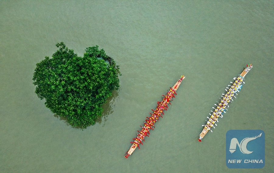 Aerial photo taken on June 14, 2018 shows people participating in a dragon boat race to greet the Dragon Boat Festival in Wenzhou City, east China's Zhejiang Province. (Xinhua/Su Qiaojiang)