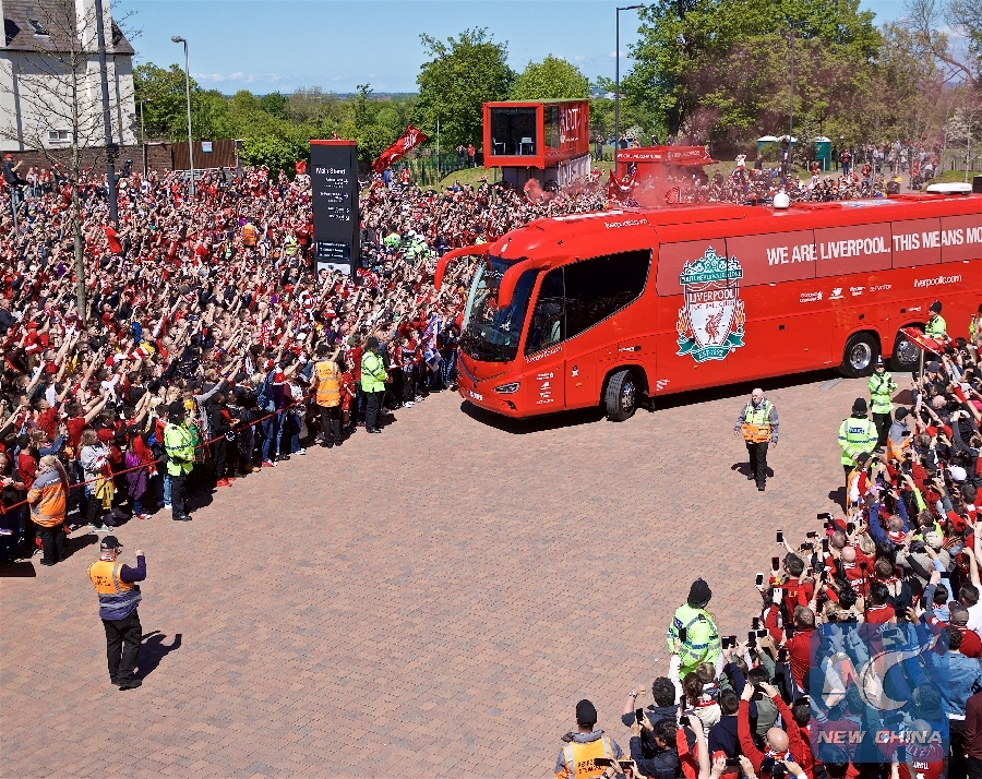 Liverpool supporters welcome the team bus to the stadium before the final English Premier League match of the season between Liverpool and Wolverhampton Wanderers at Anfield in Liverpool, Britain on May 12, 2019. (Xinhua/Han Yan)