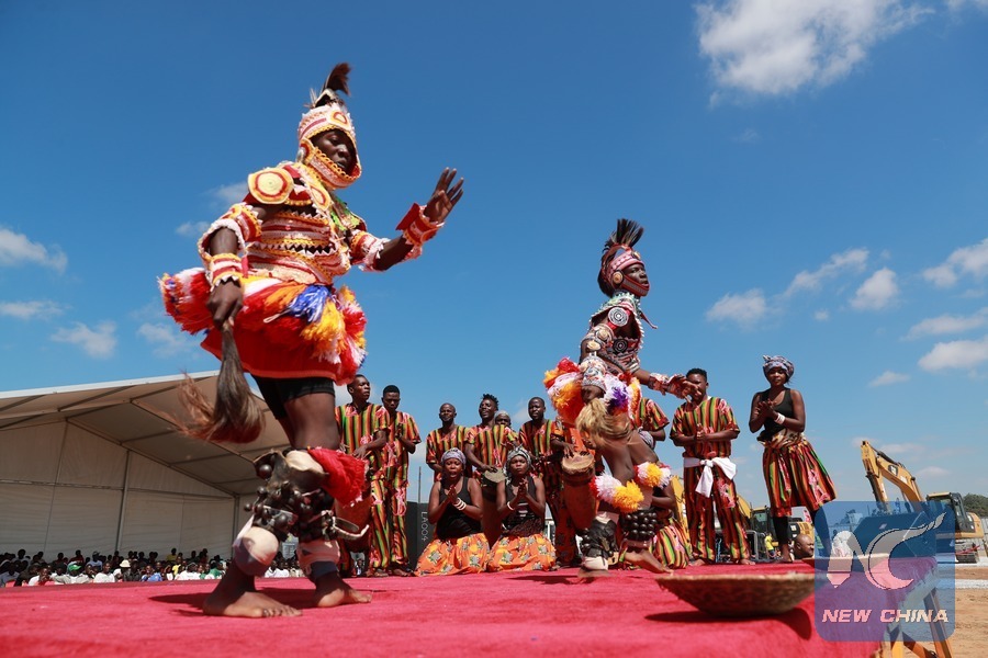 Locals perform a dance during a groundbreaking ceremony of TAZARA memorial park in Chongwe, Zambia, on May 13, 2019. (Xinhua/Peng Lijun)