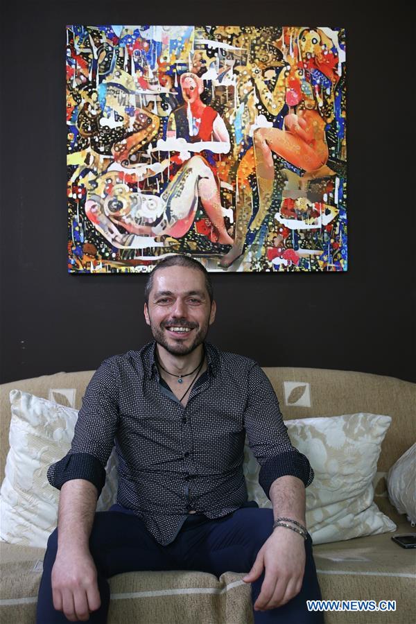 Greek visual artist-composer Dean Copa sits in front of one of his artworks inside his studio in central Athens, Greece, on May 14, 2019. In an era of technological advancement which has turned the world into a global village, enhanced cultural dialogues between East and West indicate that differences are not as important as similarities, Greek visual artist-composer Dean Copa told Xinhua on Tuesday. (Xinhua/Marios Lolos)
