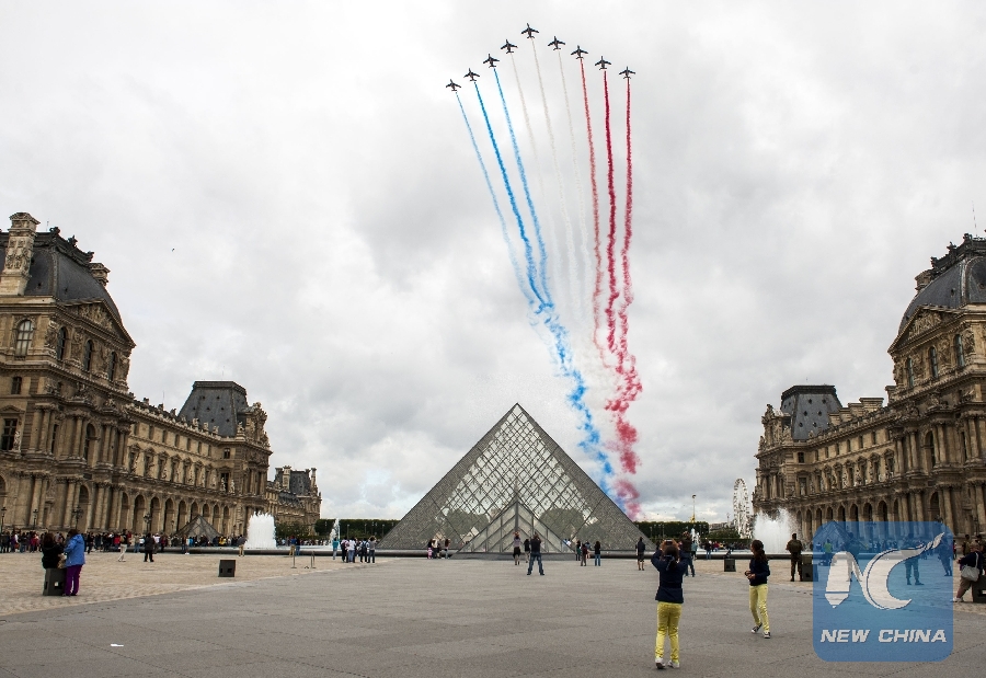 File photo taken on July 14, 2012 shows an airshow above the Louvre glass pyramid designed by world-renowned architect Ieoh Ming Pei in Paris, France. (Xinhua/Etienne Laurent)