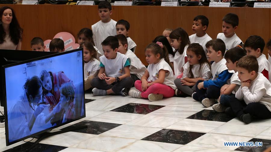 A group of children attend an event organized by the local NGO "The Smile of the Child" in Athens, Greece, on May 20, 2019. A total of 299 children went missing in Greece last year and 257 of them were eventually found, according to the police report presented during an event organized by the local NGO "The Smile of the Child" on the occasion of the International Missing Children's Day which is marked on May 25 every year. (Xinhua/Marios Lolos)