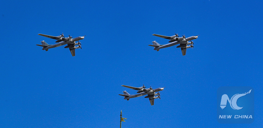 Tu-95MS strategic bombers fly over the Red Square during a rehearsal for the Victory Day parade in Moscow, Russia, May 7, 2019. (Xinhua/Bai Xueqi)