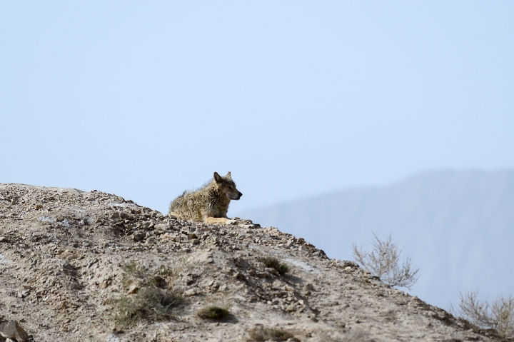 A wolf rests on the slope, looking at a railway construction site in the Altun Mountains. (Xinhua/Ding Lei)
