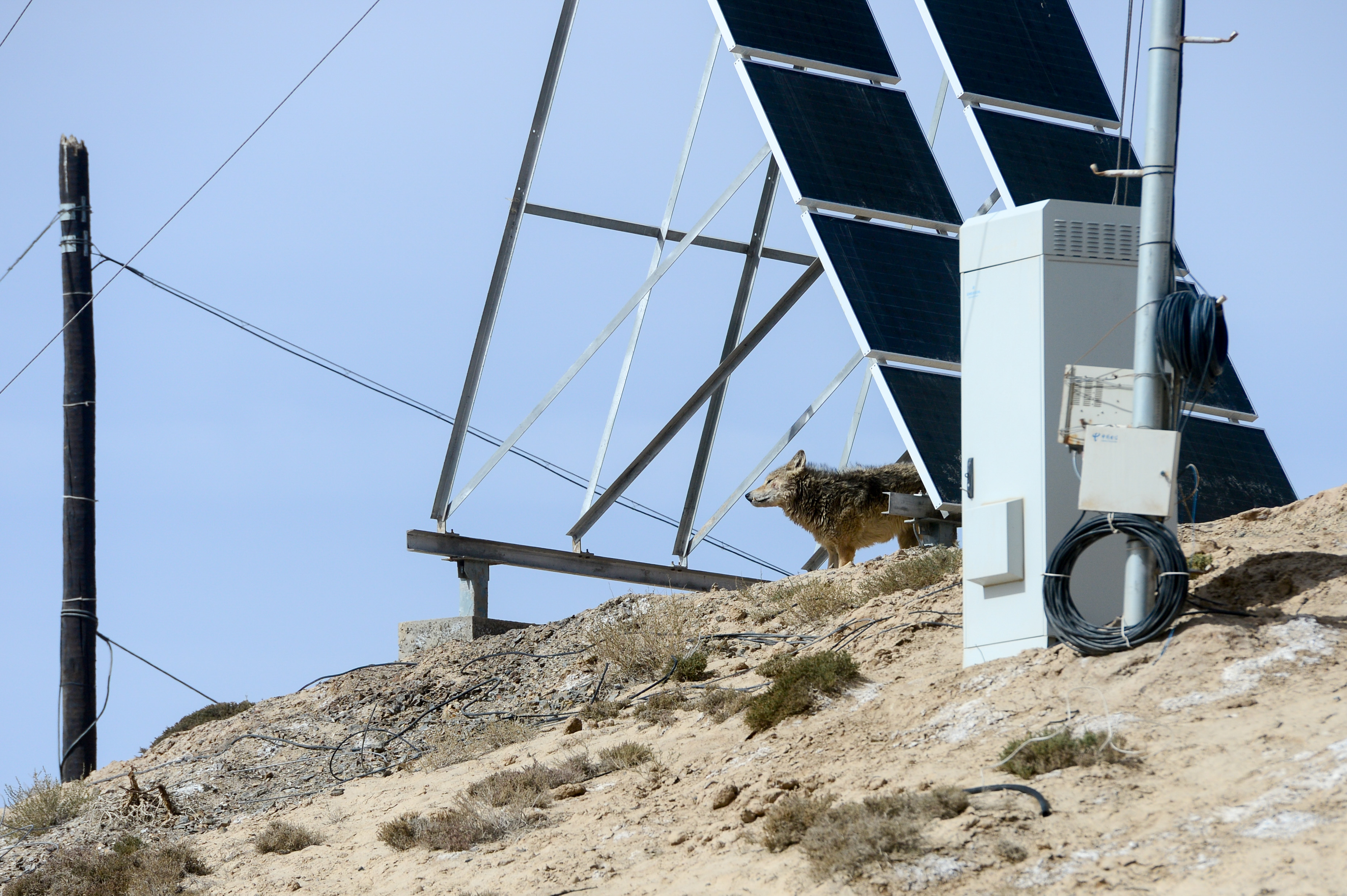 The wolf rests under the solar panels. (Xinhua/Ding Lei)