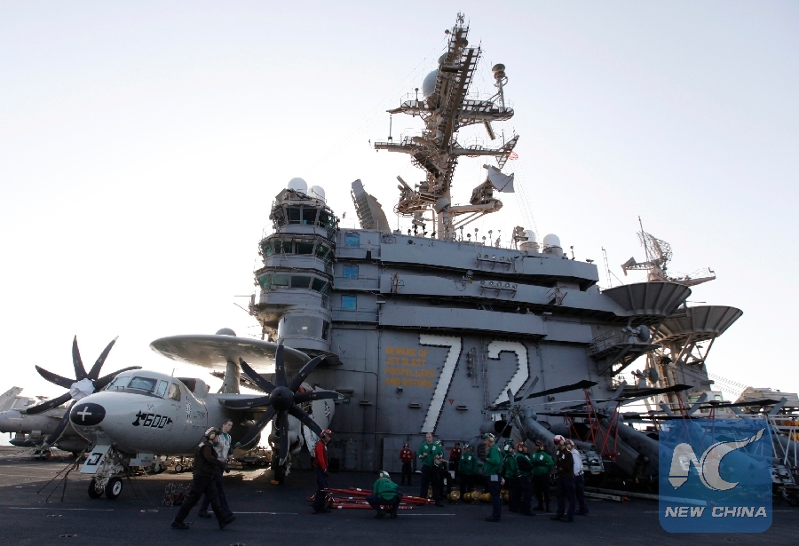 File Photo: Flight deck personnel stand on the flight deck on board the Nimitz-class aircraft carrier USS Abraham Lincoln (CVN 72) as it patrols the Arabian Gulf during a Strait of Hormuz transit, Feb. 14, 2012. (Xinhua/REUTERS)