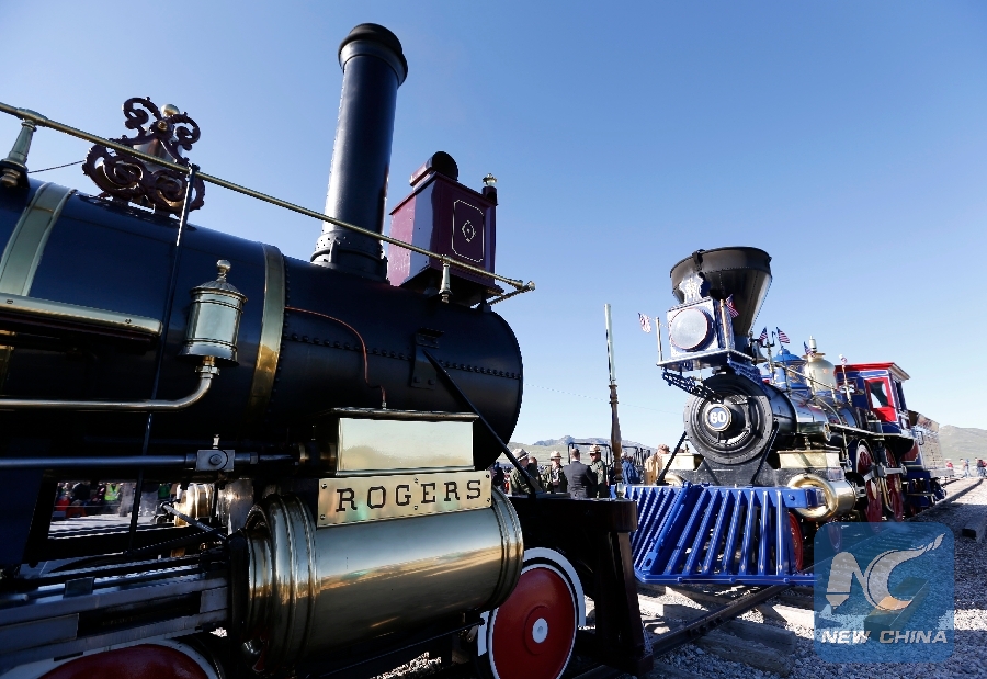 Two locomotives, "Jupiter" owned by Central Pacific Railroad and "No. 119" of Union Pacific, meet to recreate the scene 150 years ago in celebration of the 150th anniversary of the completion of the first U.S. transcontinental railroad at the Golden Spike National Historical Park at Promontory Summit, the United States, May 10, 2019. (Xinhua/Li Ying)