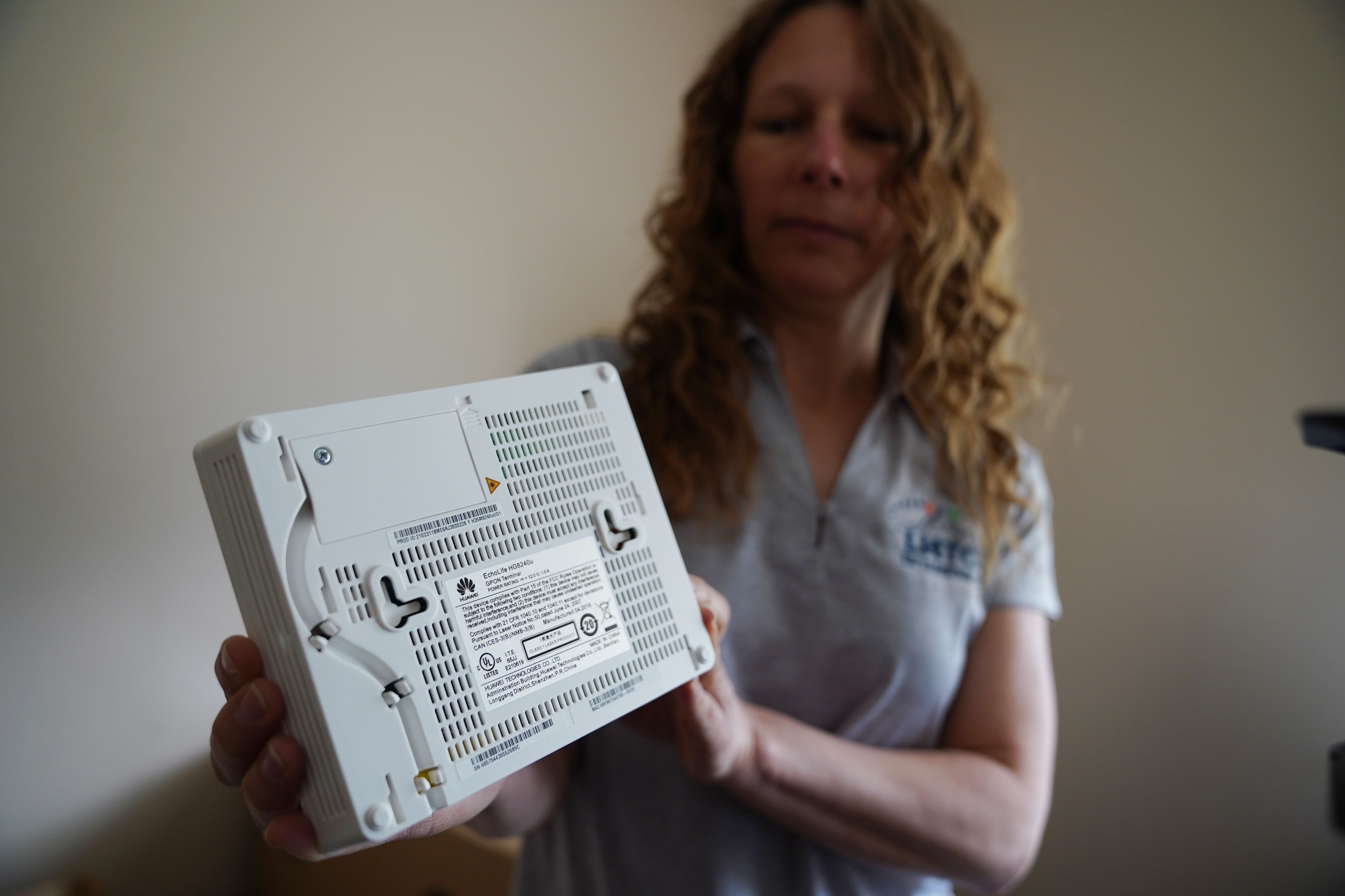 Bonnie Bond, network supervisor at LHTC's local branch, shows a Huawei GPON terminal during an interview in South Canaan Town, Pennsylvania, the United States, May 24, 2019. (Xinhua/Liu Jie)