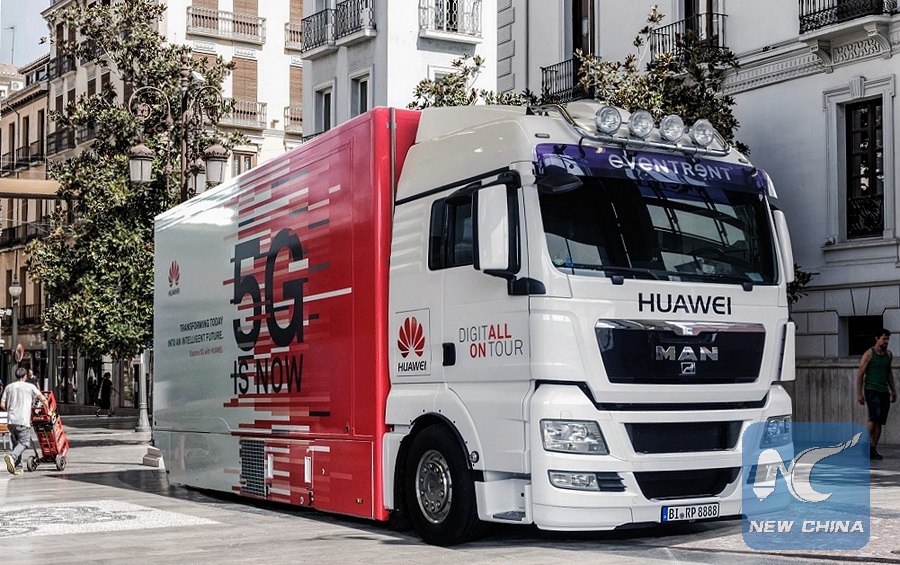 Photo taken on April 23, 2018 shows the Huawei 5G Truck at its roadshow in Madrid, Spain. (Xinhua)