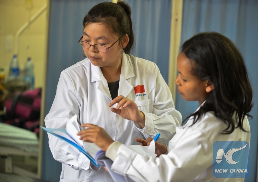Doctor Wang Zhijing (L), member of a Chinese medical team, talks with an Ethiopian doctor at the Tirunesh Beijing General Hospital in southern outskirts of Addis Ababa, capital of Ethiopia, Aug. 4, 2017. (Xinhua/Michael Tewelde)