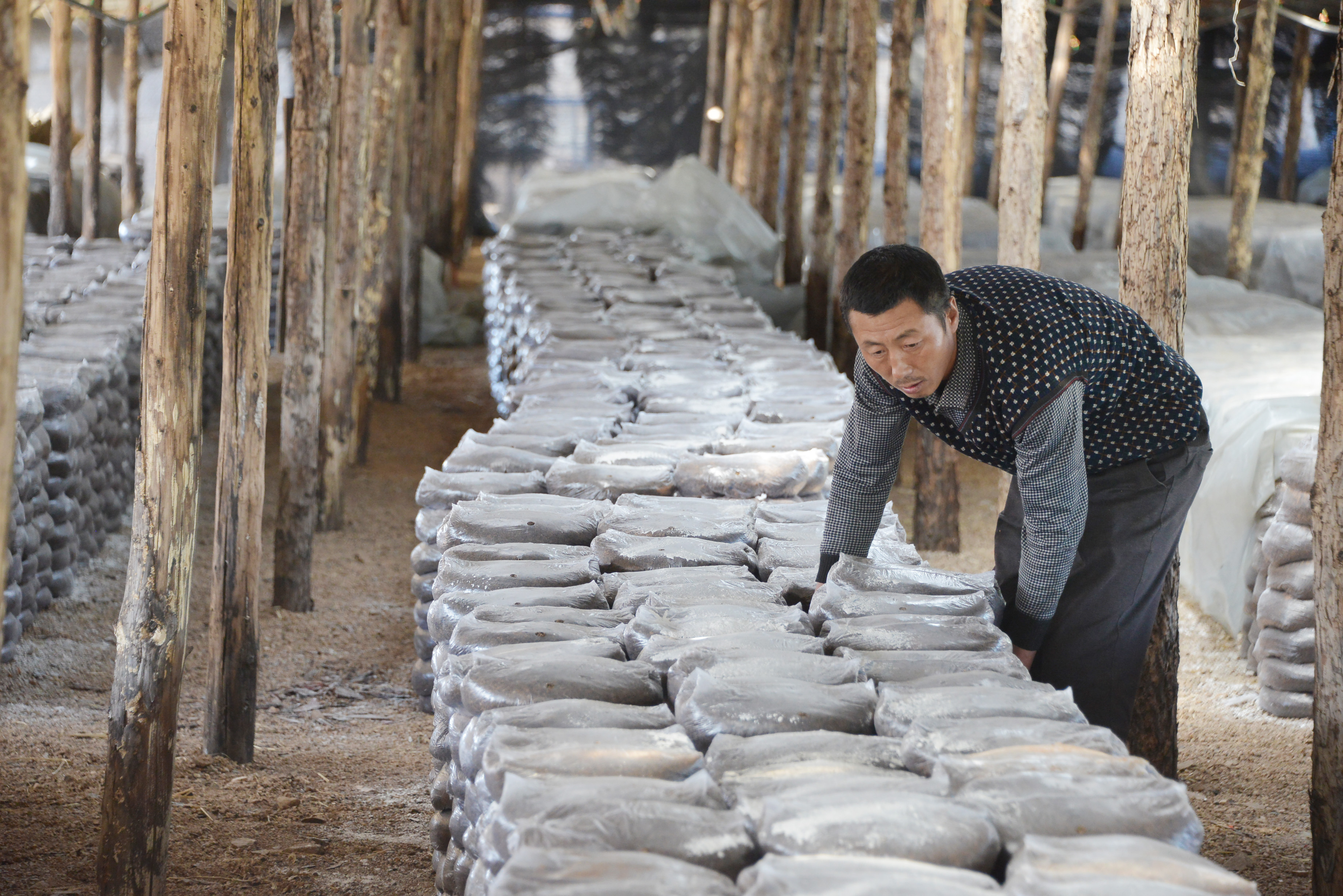 A poverty-stricken villager arranges bags of materials used for mushroom cultivation at a green house in Qiqiling Village of Oroqen Autonomous Banner, Hulun Buir, north China's Inner Mongolia Autonomous Region, April 16, 2019. (Xinhua/Wang Jing)