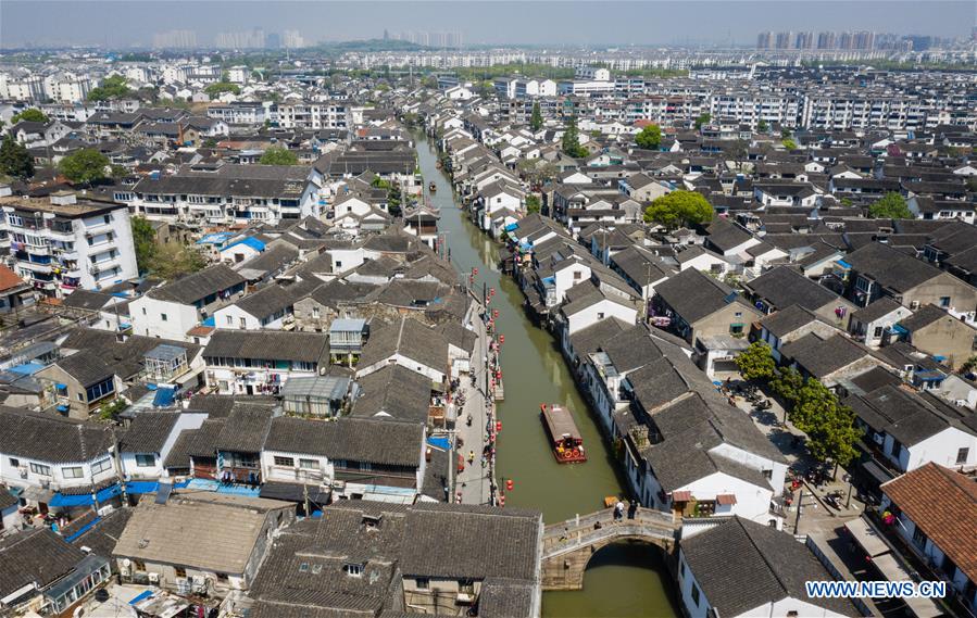 Aerial photo taken on April 18, 2019 shows the view of Shantang Street in Suzhou, east China's Jiangsu Province. Located in the east coast of mainland China, Jiangsu in recent years has made great efforts to adjust the ecological layout, optimize the industrial structure and adhere to green development. In 1997, the classical gardens of Suzhou were put on the UNESCO's heritage list. In 2018, the total number of gardens included in the "Suzhou Garden List" reached 108, and Suzhou was officially transformed from "the City of Gardens" into "the City of 100 Gardens". One sixth of the area in Jiangsu is covered by water. As a province grows with and thrives on water, the system of river chiefs originated here from the treatment of Taihu Lake. At present, there are more than 57,000 river chiefs at province, city, county, township and village levels in Jiangsu, which has made a full coverage of the water body. June 2 to 4, Beijing International Horticultural Exhibition ushered in "Jiangsu day" event. The event highlights the integration of classic industry and traditional culture, and comprehensively promotes the horticultural achievements in Jiangsu characteristics. (Xinhua/Li Xiang)