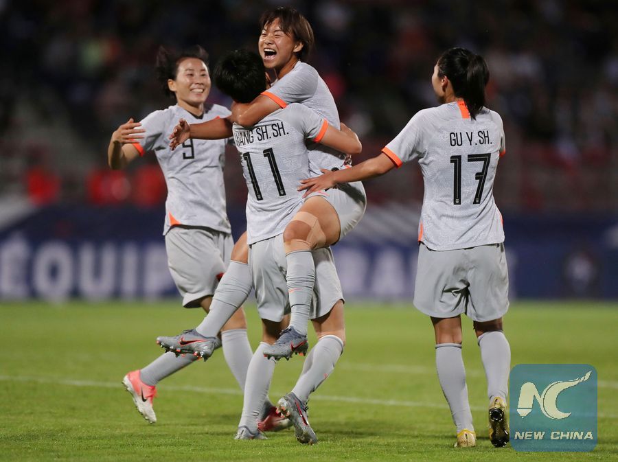 Wang Shanshan (2nd L) of China celebrates with her teammate Wang Shuang (2nd R) during a friendly soccer match between France and China in Creteil, France, on May 31, 2019. (Xinhua/Gao Jing)