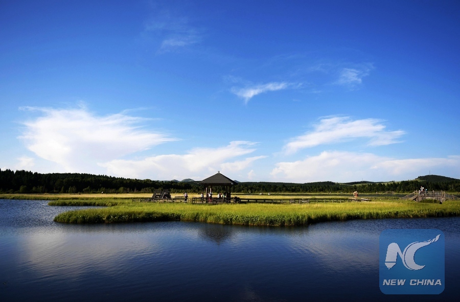 Tourists visit the Qixing Lake Scenic Area of Saihanba National Forest Park in north China's Hebei Province, July 11, 2017. (Xinhua/Wang Xiao)