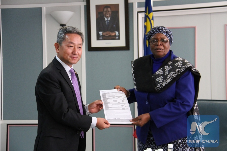 Chinese ambassador to Namibia Zhang Yiming (L) hands over the donation from the Red Cross Society of China to Namibia's Deputy Prime Minister Netumbo Nandi-Ndaitwah in Windhoek, Namibia, on June 7, 2019. The Red Cross Society of China Friday donated 150,000 U.S. dollars towards Namibia's drought. (Xinhua/Wu Changwei)