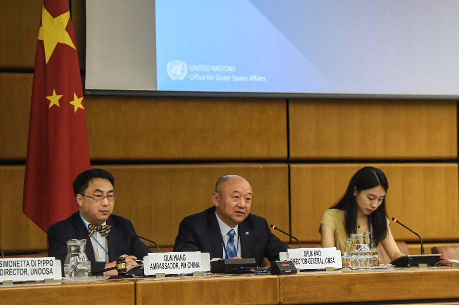 Hao Chun (C), Director General of the China Manned Space Agency (CMSA), speaks at a conference in Vienna, Austria, June 12, 2019. (Xinhua/Guo Chen)