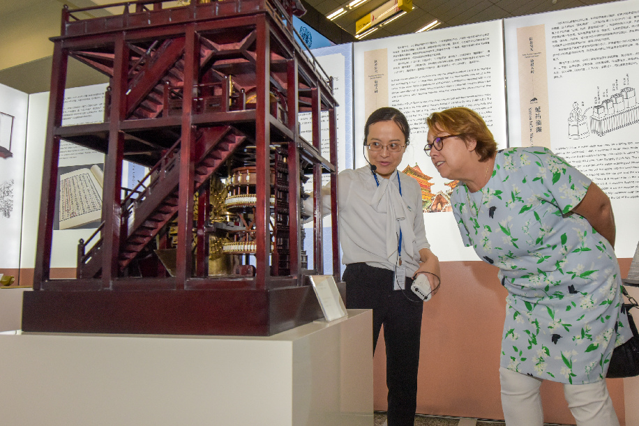 Simonetta Di Pippo (R), Director of the United Nations Office for Outer Space Affairs, visits the Chinese navigation exhibition "From Compass to BeiDou" in Vienna, Austria, on June 11, 2019. (Xinhua/Guo Chen)