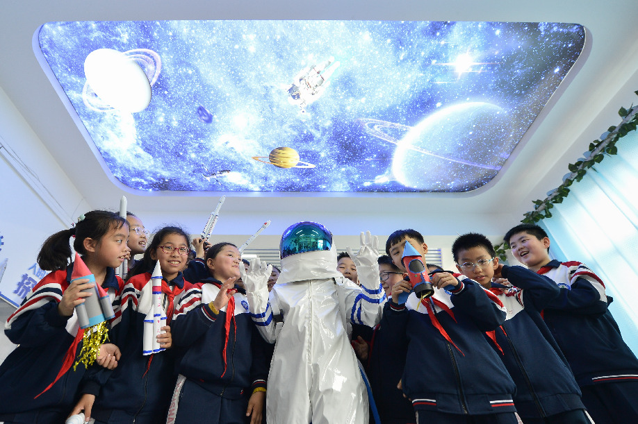 Students of Zhuhelu Primary School take part in the theme activity of "knowing space knowledge, igniting space dream" in Hanshan District of Handan, north China's Hebei Province, April 24, 2019. (Xinhua/Wang Hongchao)