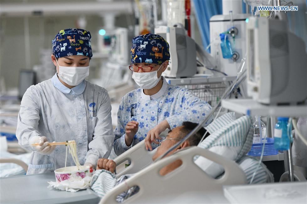 Nurse Ding Juan (R) takes care of a patient with her colleague at the intensive care unit (ICU) of the First Affiliated Hospital of University of Science and Technology of China in Hefei City, east China's Anhui Province, May 9, 2019. Chinese government subsidies to public hospitals have increased by 15.6 percent annually since 2010, a health official said Friday. The government allocated 270.5 billion yuan (39.26 billion U.S. dollars) of subsidies directly to public hospitals in 2018, up from 84.9 billion yuan in 2010, said Zhu Hongbiao, a senior official with the National Health Commission, at a press conference. (Xinhua/Zhang Duan)