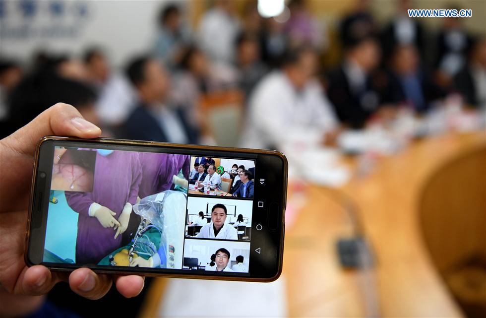 Mobile phone footage in this photo shows experts of the Second Hospital of Anhui Medical University (AMU) guiding an endoscopic surgery conducted by the Shitai County People's Hospital through a 5G-supported remote collaborative operating platform at the Second Hospital of AMU in Hefei, east China's Anhui Province, May 10, 2019. Chinese government subsidies to public hospitals have increased by 15.6 percent annually since 2010, a health official said Friday. The government allocated 270.5 billion yuan (39.26 billion U.S. dollars) of subsidies directly to public hospitals in 2018, up from 84.9 billion yuan in 2010, said Zhu Hongbiao, a senior official with the National Health Commission, at a press conference. (Xinhua/Liu Junxi)