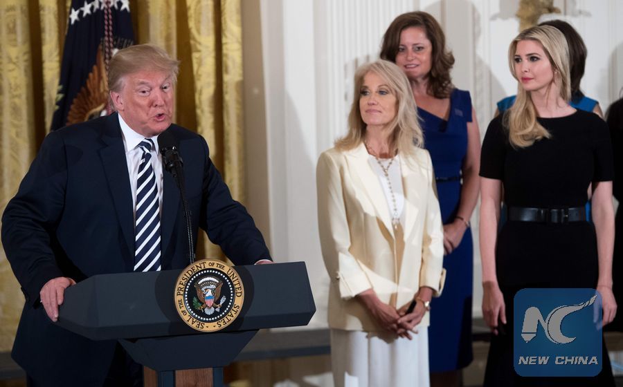 U.S. President Donald Trump speaks alongside daughter Ivanka Trump (R) and Kellyanne Conway (C), White House Counselor, during an event in honor of Military Mothers and Spouses in the East Room of the White House in Washington, DC, May 9, 2018. (Xinhua/AFP PHOTO)
