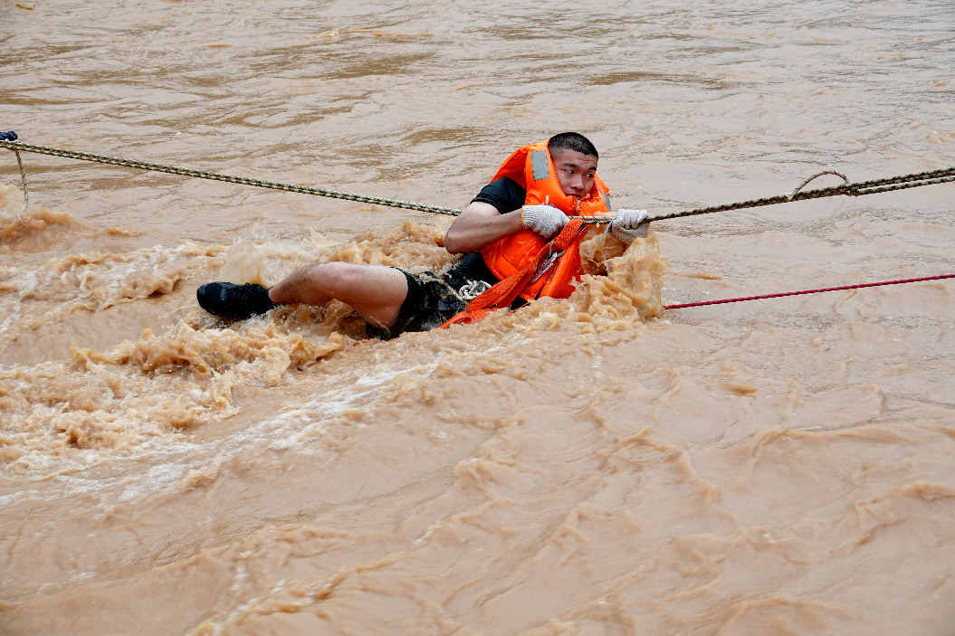 An armed police officer crosses a flooded river to rescue trapped residents in Lianping County, south China's Guangdong Province on June 13, 2019. (Xinhua/Liao Jian)
