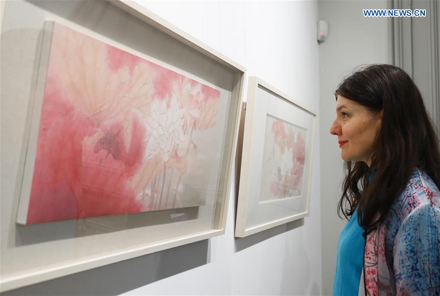 A visitor views paintings during the "Poetic Jiangnan: Style of China" exhibition in Brussels, Belgium, June 14, 2019. After visiting Russia, Japan and the United States, the "Dynamic Shanghai" event has made the long-anticipated return to Belgium with the "Poetic Jiangnan: Style of China" exhibition here at the China Cultural Centre. (Xinhua/Pan Geping)