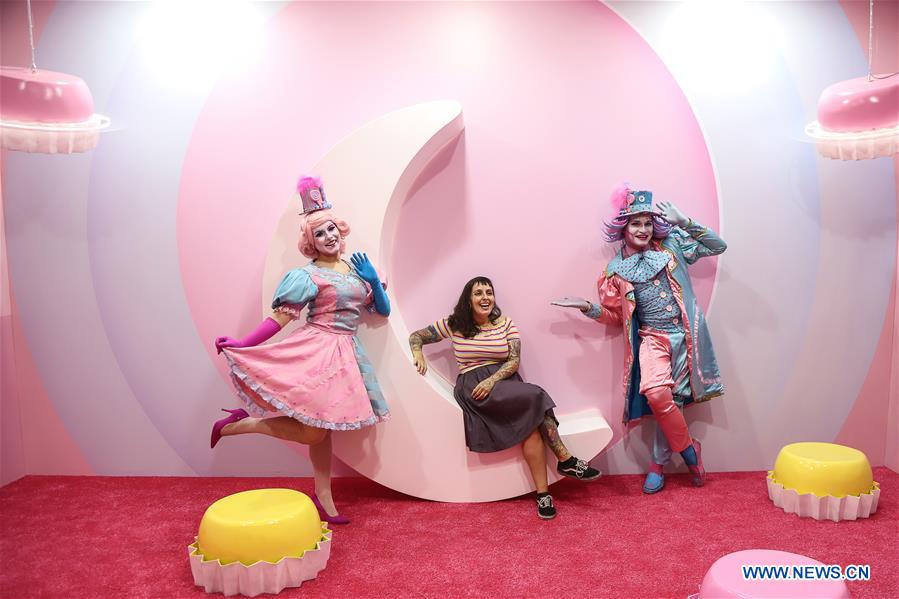 Artists perform at the "Sweet Art Museum" installation art exhibition in Sao Paulo, Brazil, June 19, 2019. The exhibition will open to the public on June 20 and will last to late August. (Xinhua/Rahel Patrasso)
