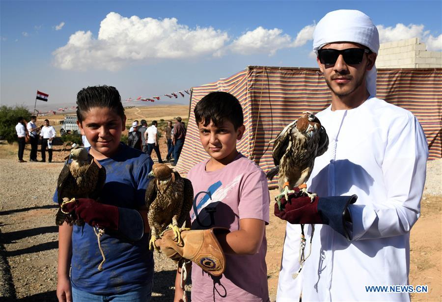 Syrians hold falcons during celebrations of the harvest of the famous Damascene rose in the town of al-Marah, north of Damascus, Syria, on June 20, 2019. (Xinhua/Ammar Safarjalani)