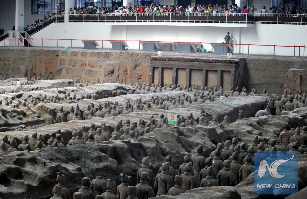 Tourists visit the terracotta warriors and horses at the Emperor Qinshihuang's Mausoleum Site Museum in Xi'an, capital of northwest China's Shaanxi Province. (Xinhua/Chen Haining)