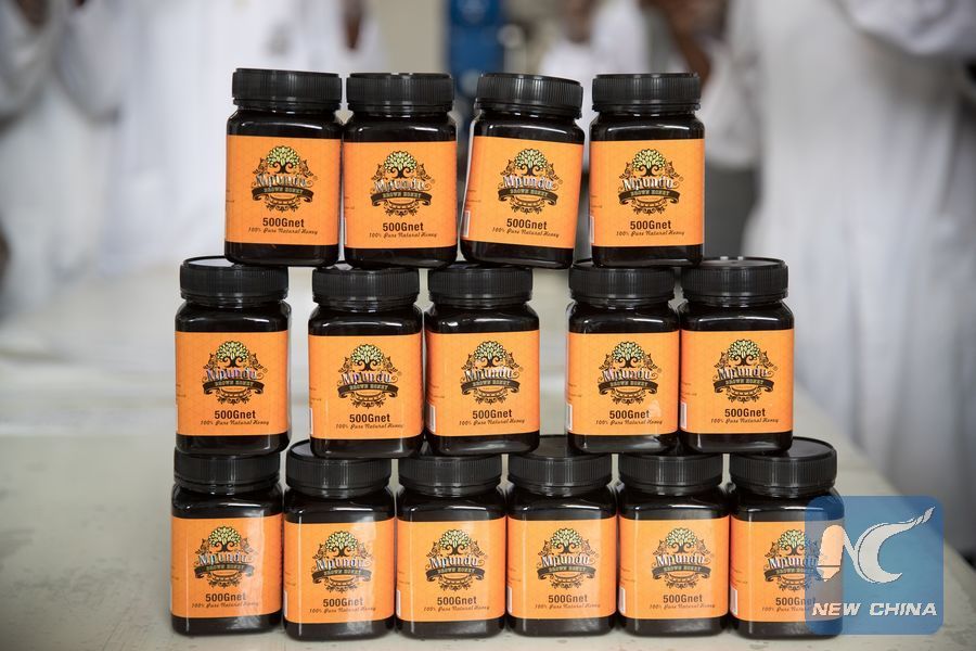 File photo shows bottles of honey are seen at Mpundu Wild Honey, a Chinese-run firm, in central Zambia's Kabwe town, on Nov. 2, 2018. (Xinhua)