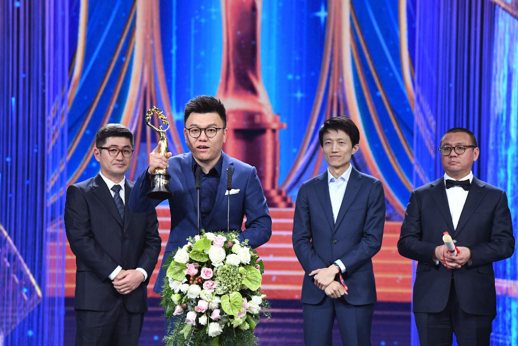 Winners of the Tiantan Award for Best Visual Effects for movie "The Wandering Earth" celebrate during the closing ceremony of the ninth Beijing International Film Festival in Beijing, capital of China, April 20, 2019. (Xinhua/Chen Yehua)