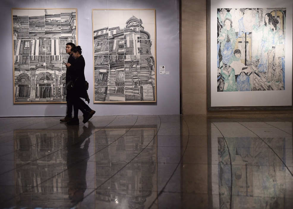 People visit the exhibition of New Vision of Chinese Art 2018 in Beijing, capital of China, March 12, 2018. (Xinhua/Luo Xiaoguang)