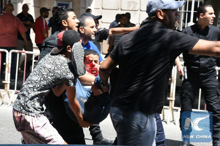 People carry an injured policeman to an ambulance from the site of a bomb attack in Tunis, Tunisia, June 27, 2019. (Xinhua/Adele Ezzine)