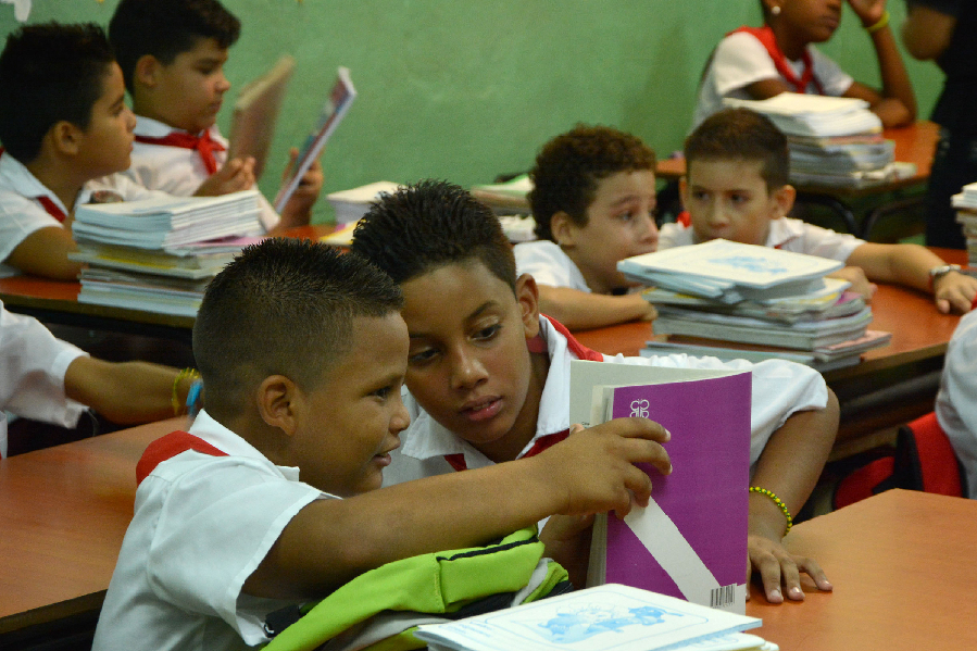 Children attend class during the opening of a new semester at the Elementary School of Simon Rodriguez in Havana, Cuba, on Sept. 5, 2016. About 2 million Cuban students returned to schools and universities on Monday. (Xinhua/Joaquin Hernandez)