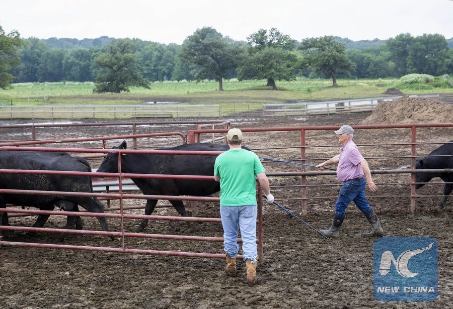 Bill Pellett (R) drives cows for artificial insemination procedures on his farm in Atlantic, Iowa, the United States, on June 20, 2019.(Xinhua/Wang Ying)