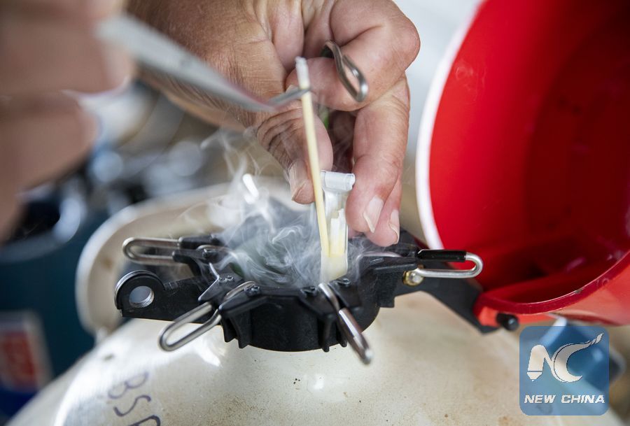 Bill Pellett's long-time business partner Phil Ham takes semen out of a tank with liquid nitrogen as his son Cody Ham carries out artificial insemination procedures on Bill Pellett's farm in Atlantic, Iowa, the United States, on June 20, 2019. (Xinhua/Wang Ying)